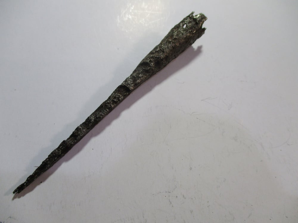 This one was hollowed to fit over the shaft of the spear that was cut down to a point to fit very tightly inside the iron spear point. But unlike others, this one only had a couple of inches of shaft imbedded. I can't comment on which would be deadlier--a heavy thick spear point or a more syringe-like very narrow one. With enough power behind them, throwing with a high arch to rain on the enemy or closer with a straigh low angle toss, pretty much same results. And spears were often the weapons used in close combat as well. Any way it was done, before these pieces rusted for 1,000-1,500 years buried along with the Roman Empire, they were sharp and deadly.